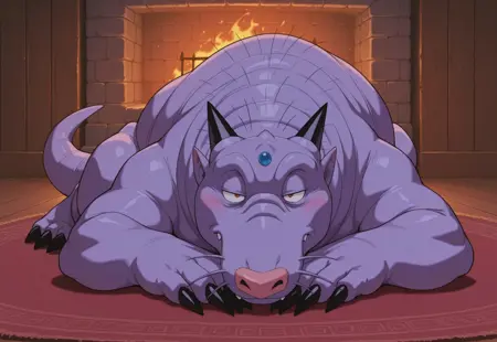 标签: 2d, 四趾, 男性, 鳞片, Moleshenron, 摩尔, 怪物, 胡须, 粉色鼻子, 紫色皮肤, 黑色角, 红色瞳孔, 黑色爪子, 趾爪, 尾巴, 尖耳朵, 蓝色额头宝石