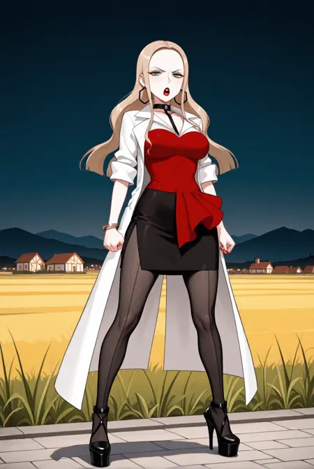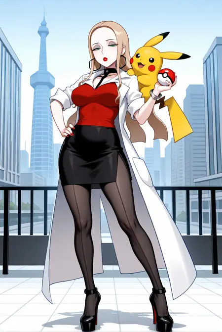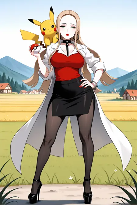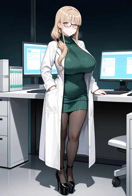 | Trained Words | Oleana, long hair, blonde hair, green eyes, sidelocks, earrings, black skirt, miniskirt, bracelet, black pantyhose, black choker, makeup, red blouse, frills, lipstick, red nails, side slit, sleeves rolled up, hoop earrings, lab coat, red lipsCopied! Oleana, long hair, blonde hair, blunt bangs, hair over shoulder, side ponytail, green eyes, lab coat, sweater, glasses, turtleneck sweater, green sweater, ribbed sweater, black-framed eyewearCopied! |