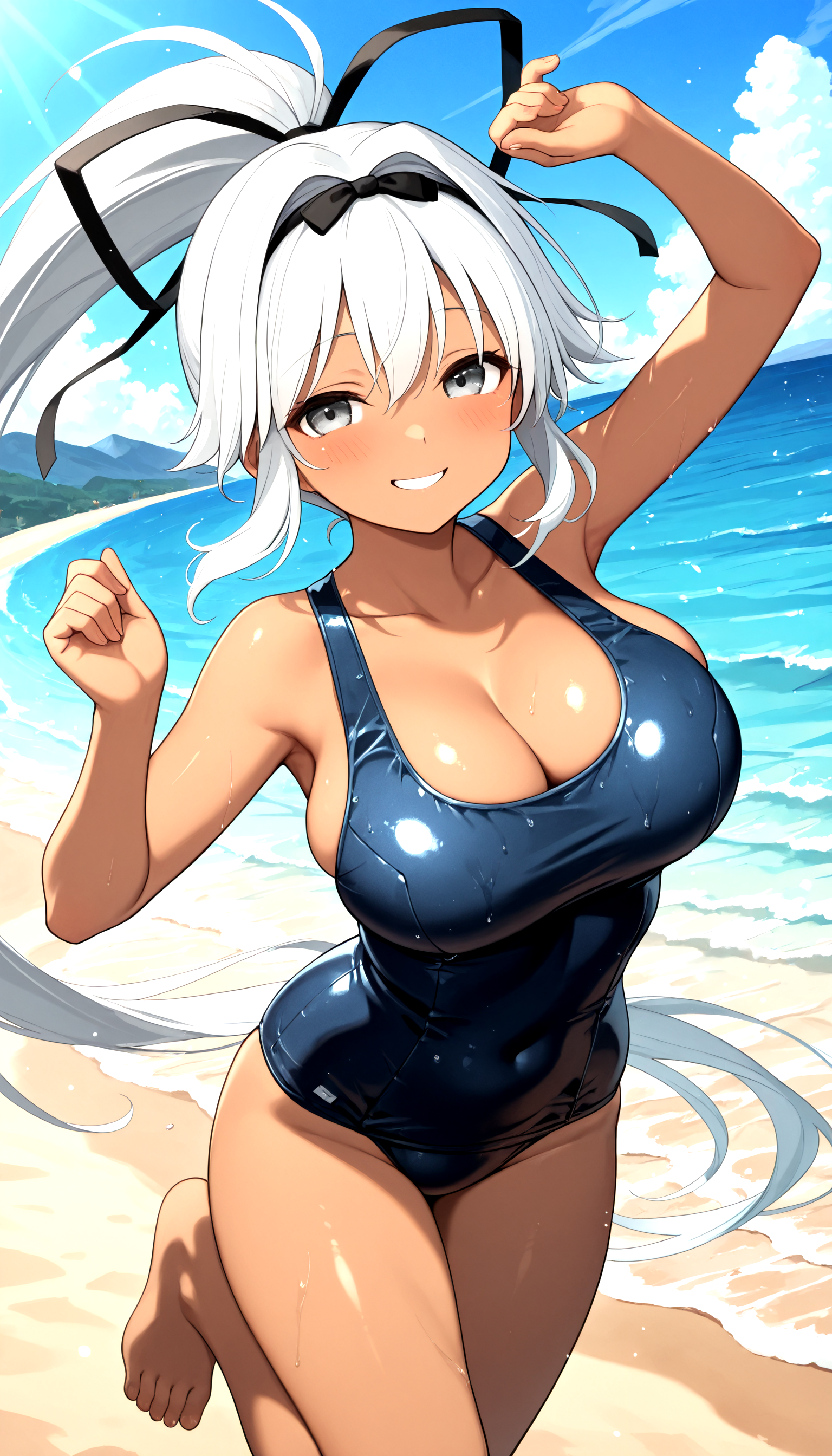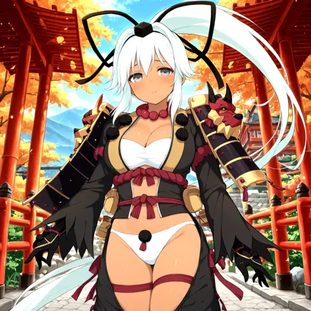 New Wave G Burst衣装: yuyaki_senkag, nwgb, feathered_sleeves, feathered_knee-high_boots, feathered_loincloth, swords_on_back, grey_eyes, short_shorts