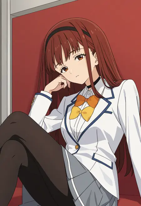 • 검은 헤어밴드, 회색 치마, 흰 셔츠, 흰 재킷, 플리츠 치마, 블레이저, 네크 링, 검은 팬티스타킹,