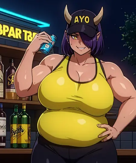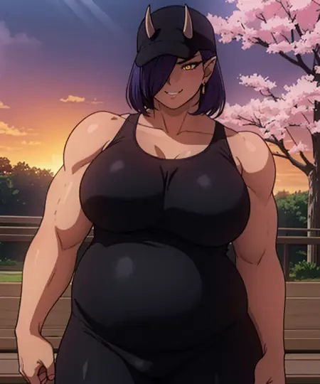 외모 프롬프트 힌트: 뿔, 한쪽 눈을 가리는 머리카락, 보라색 머리, 노란 눈, 통통함,