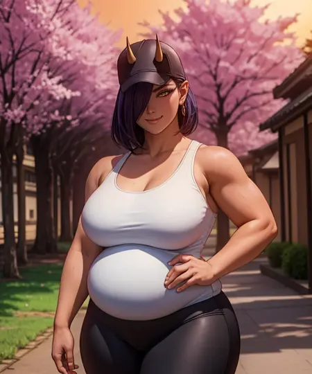짐 옷차림 부정 프롬프트: 허리 노출, 소매, 보라색 레깅스, 보라색 테이크탑, 팔밴드,