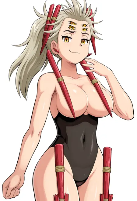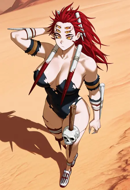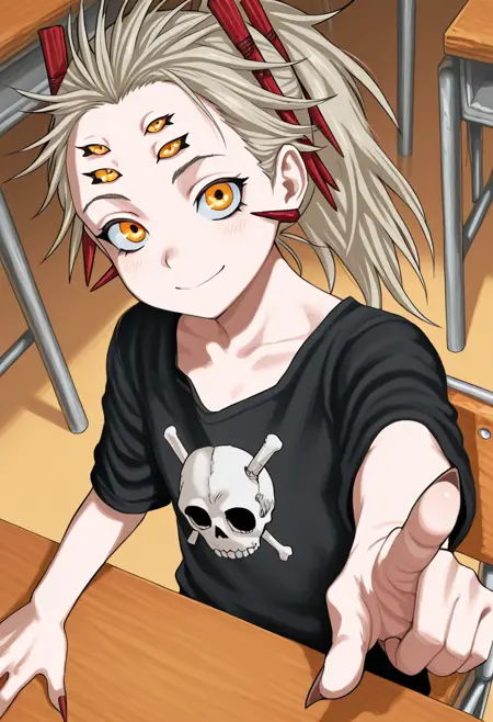 Lora尚未学会始终正确显示Shimada的六只眼睛,通常会画出八只。要减少眼睛数量,请降低“extra eyes”标签的权重,例如 (extra eyes:0.8) 或更低。这是第二次尝试训练Lora正确显示眼睛数量。第一次我使用了“6eyes”标签进行训练,但结果更差。目前我尚不清楚如何解决这个问题——眼睛数量和中远距离画面中眼睛质量低下,必须多次生成才能获得理想图像,或手动修改。
