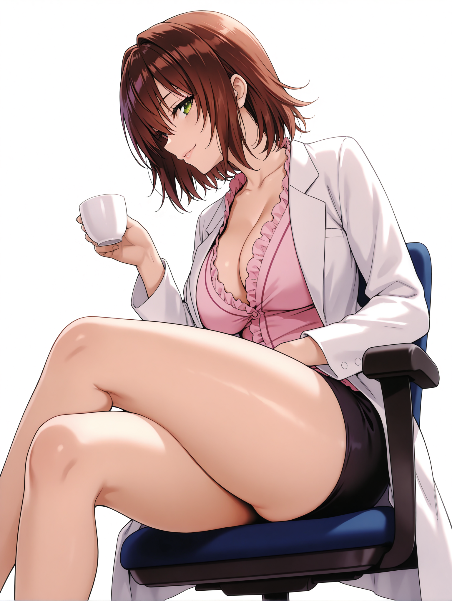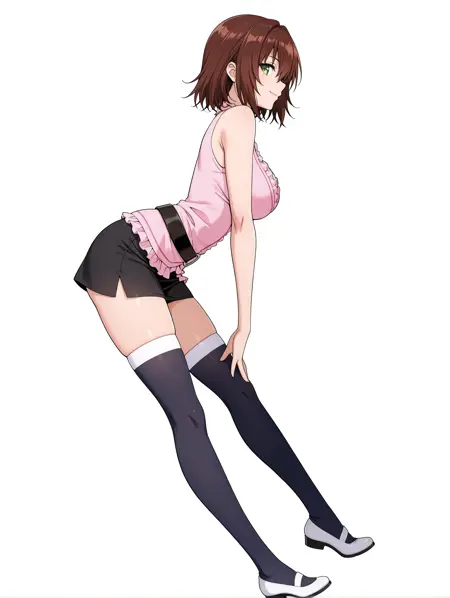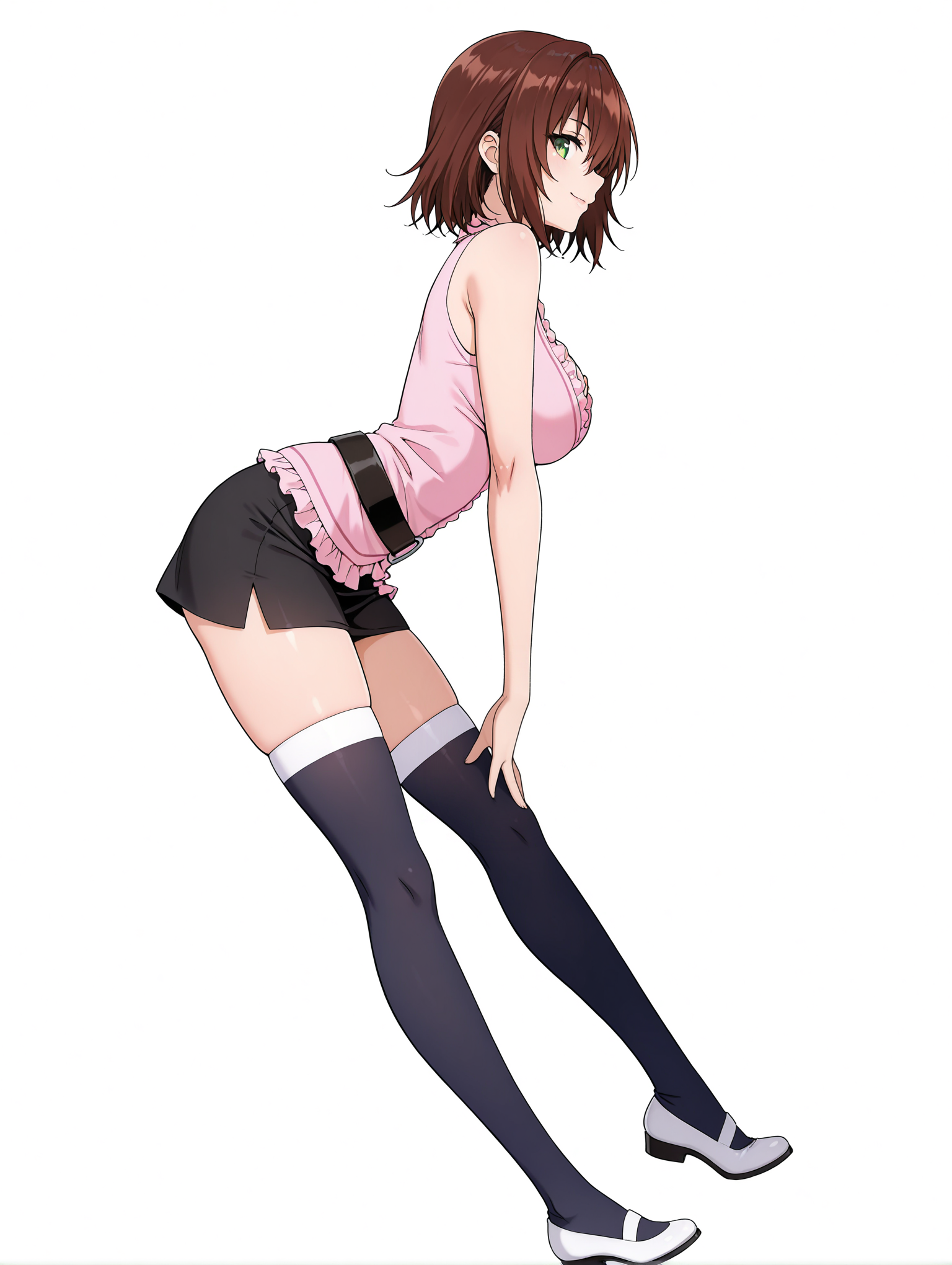 ※あるいは・r_clothes,pink frilly top,deep cleavage, lingerie style,black mini skirt, black thigh-high stockings, white heels,