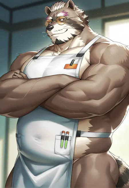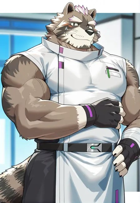 1boy, solo, male focus, viscunam, old male, white hair, short hair, dark brown eyes, raccoon boy, furry, furry male, gradient hair,