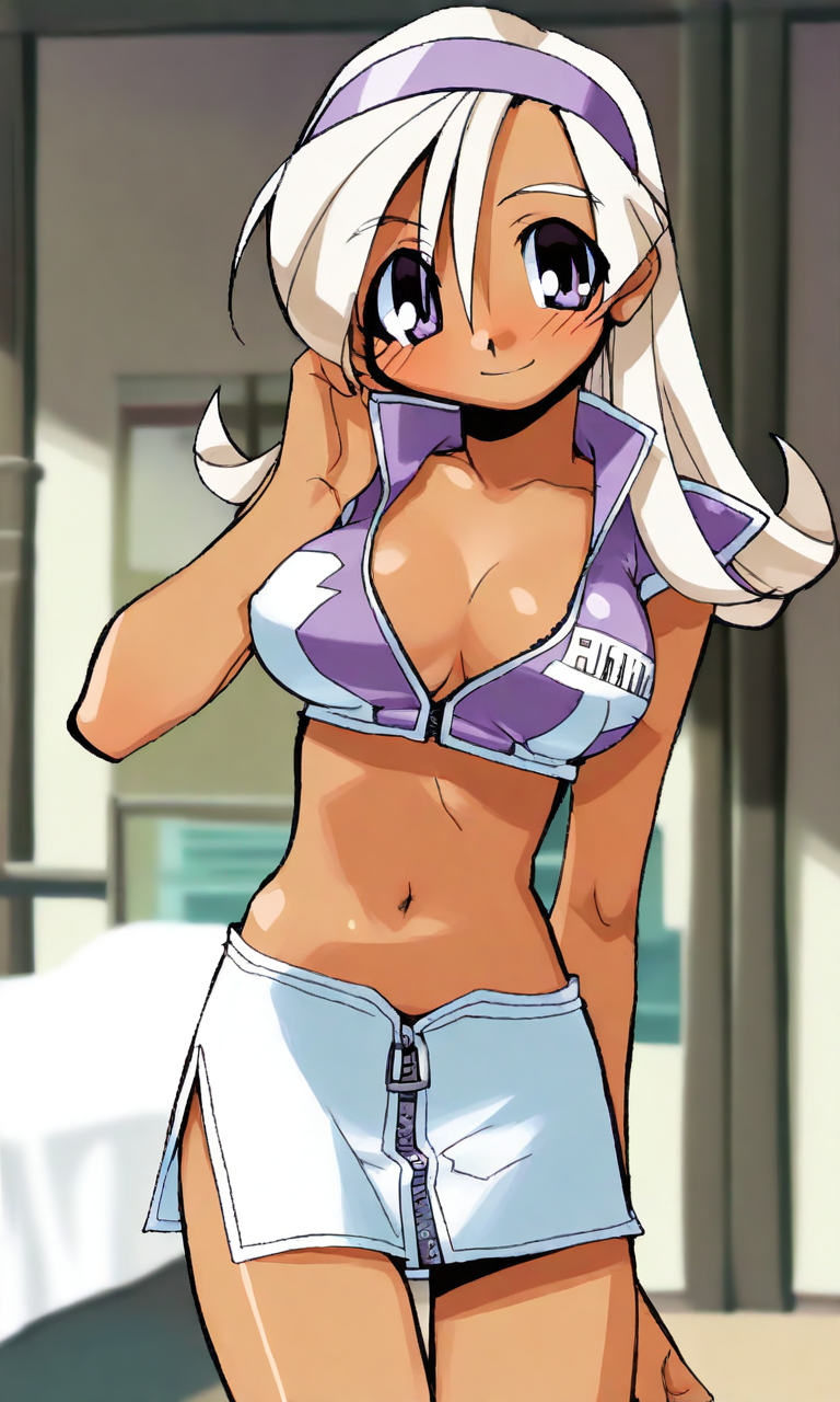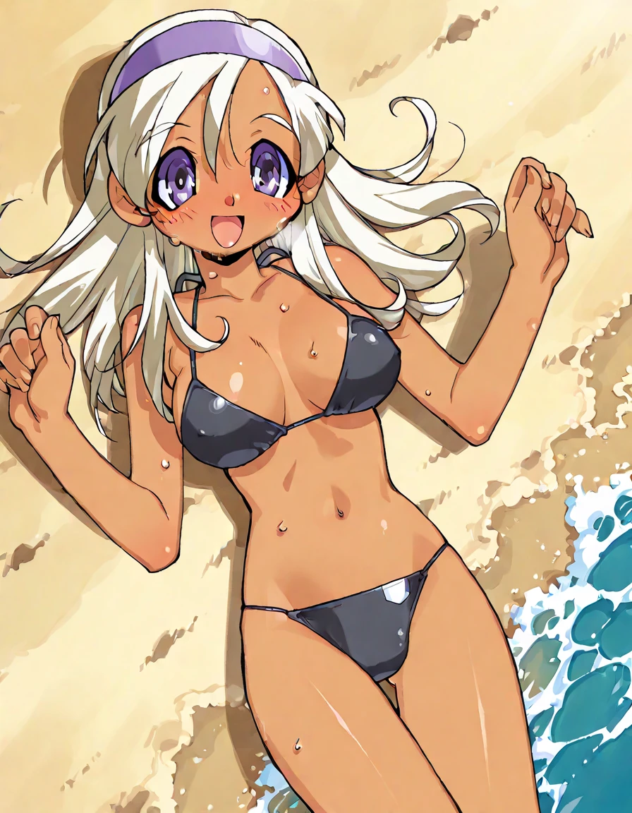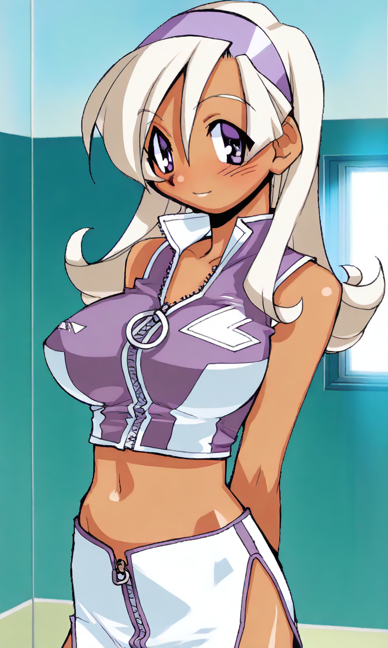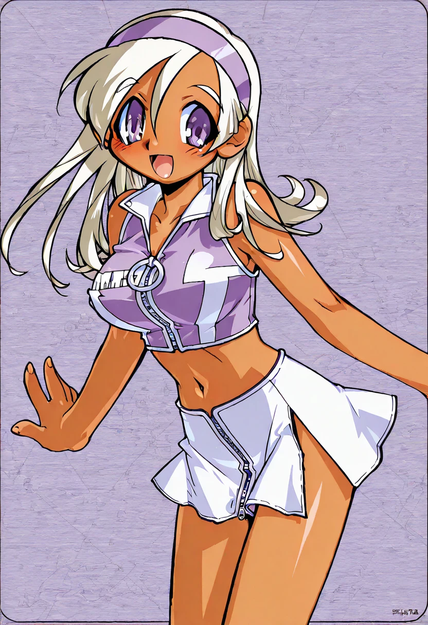 (anime coloring,official art,akatsuki gomoku),Hyuuga miki,Final Romance, Long hair, Blonde hair,((Brown skin)),purple hair band,purple eyes,large breasts