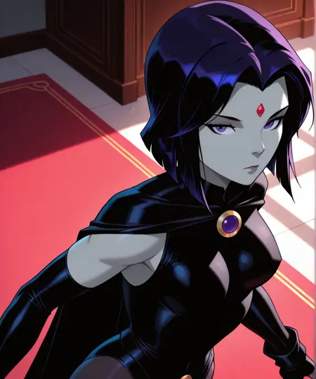 복장: 부츠, 손가락 없는 장갑, 진한 파란색 망토, 진한 파란색 레오타드, 팬티스타킹