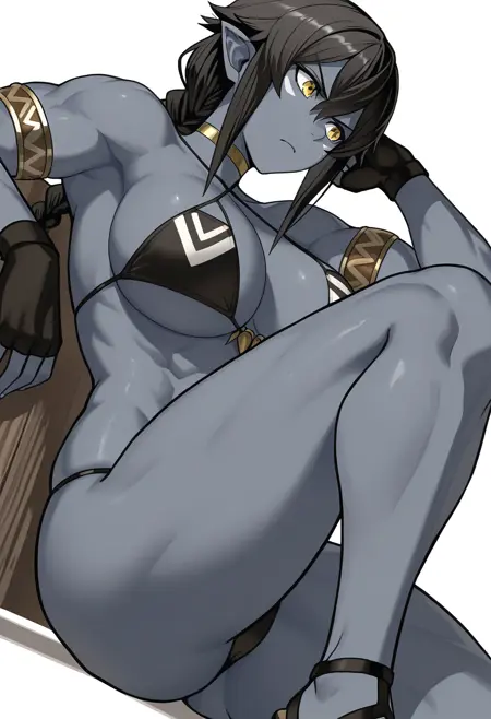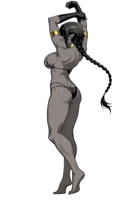 basdia/cnn, basdiabase/cnn,long hair, pointy ears, large breasts, muscular, hair between eyes, black hair, braid,yellow eyes, facial mark,