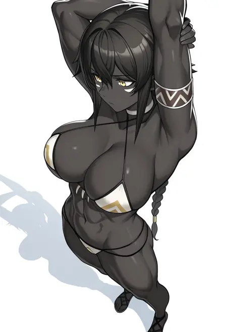 basdia/cnn, basdiaevo/cnn,tattoo,long hair, pointy ears, large breasts, muscular, hair between eyes, black hair, braid,yellow eyes, facial mark,