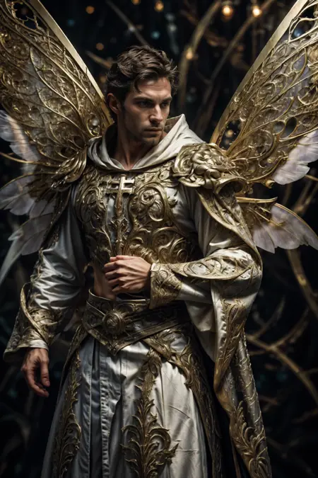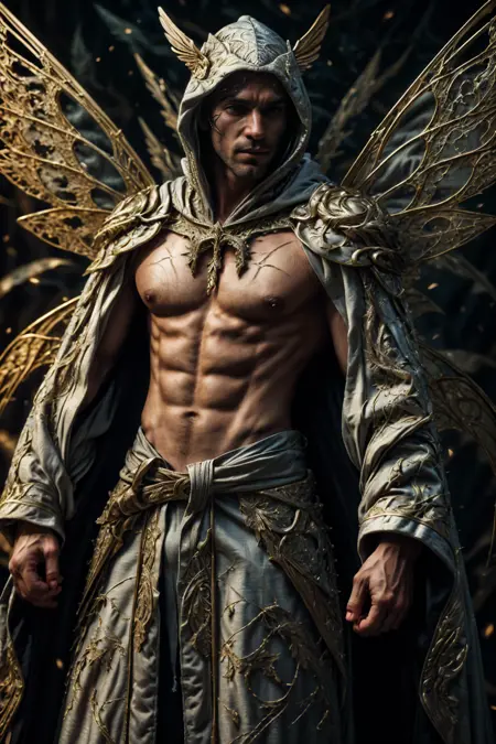然后再加上与该铠甲套装相关的具体描述,例如:“fractal wizard robe, holding staff, wizard hat”(分形法师长袍,手持法杖,戴着法师帽)。