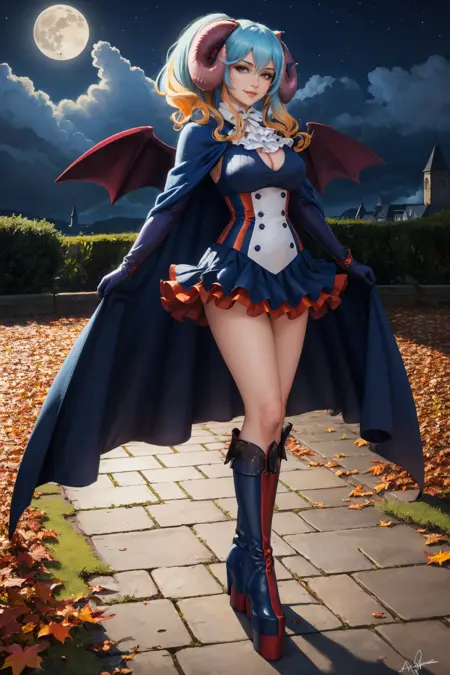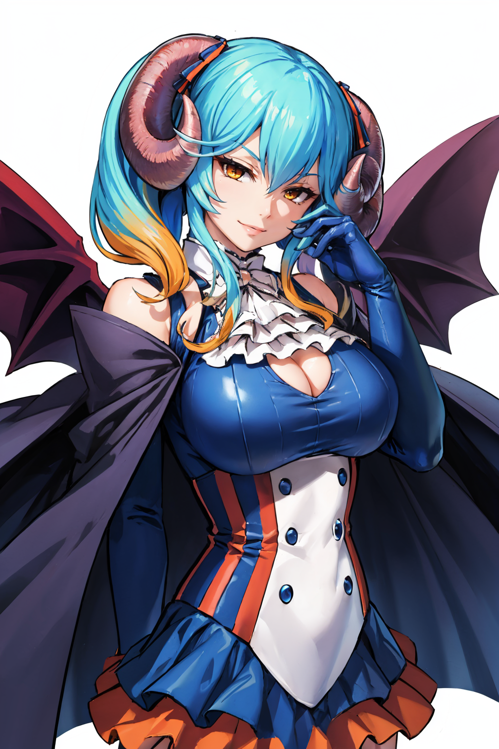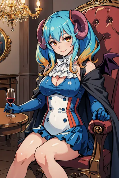 彼女の典型的な外見を表現するには、"角、翼、アスコット、ドレス、胸元、マント、肘まである手袋" を追加してください。