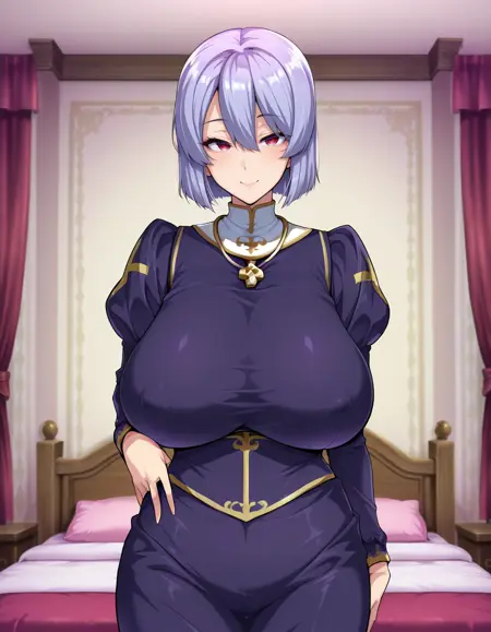 Rietta: 1girl, rietta, 파란 머리, 파란 눈, 보라색 성직자 복장