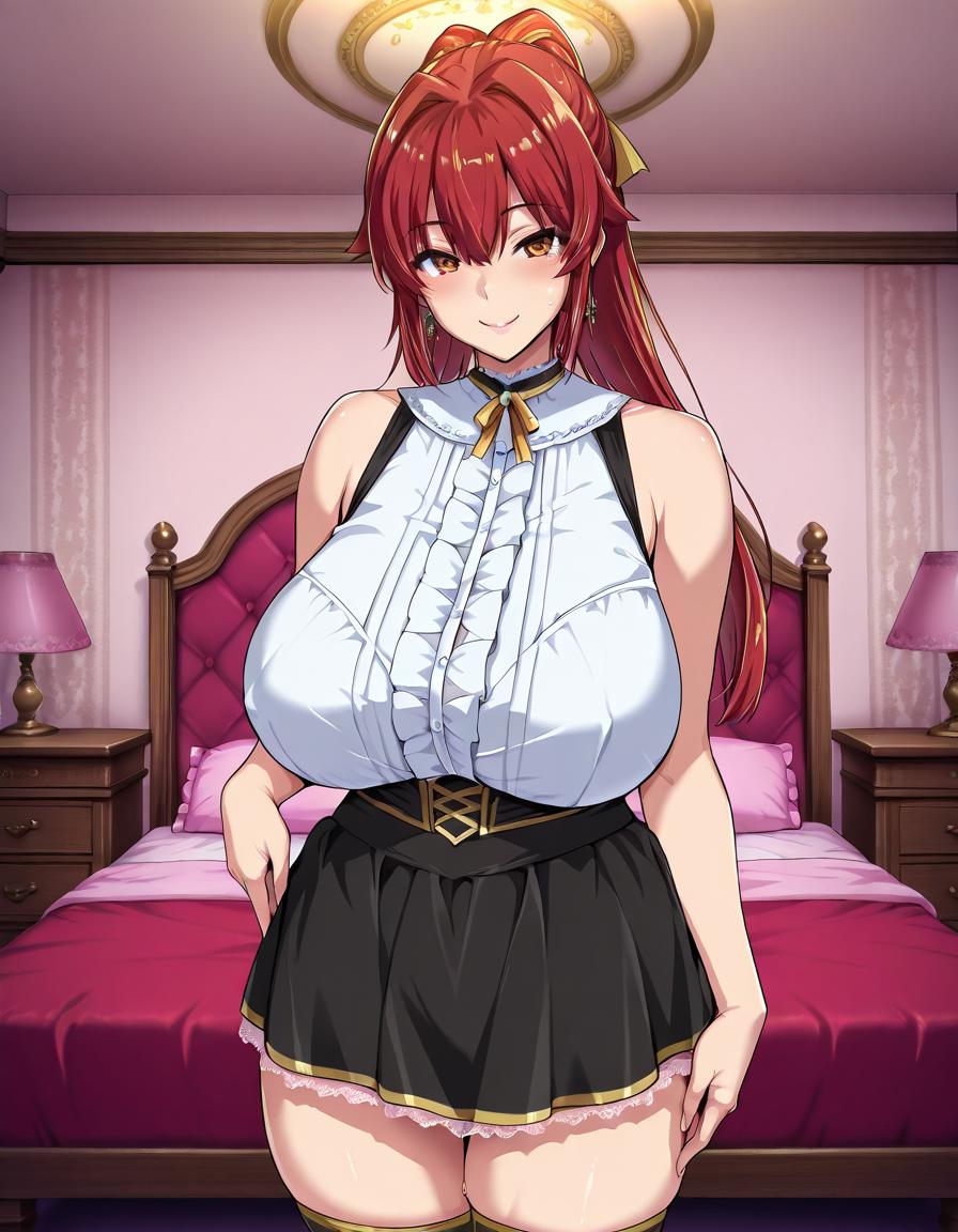 Arika: 1girl, arika, 빨간 머리, 황금색 눈, 흰 셔츠, 검은 주름치마, 허벅지까지 오는 양말