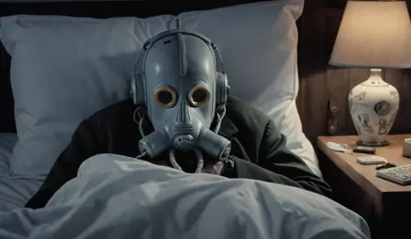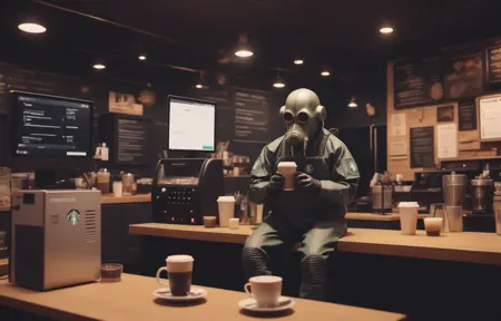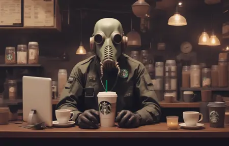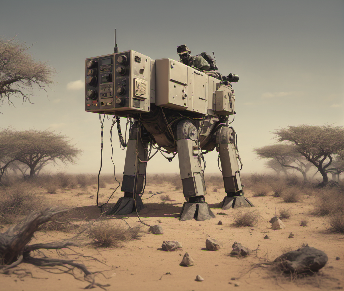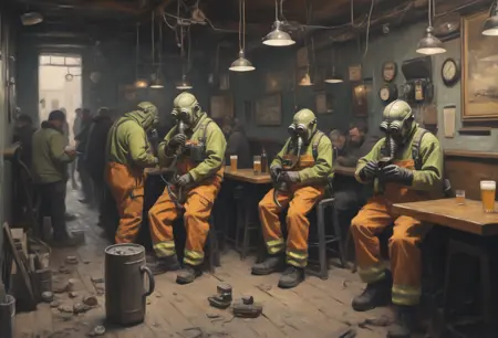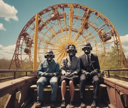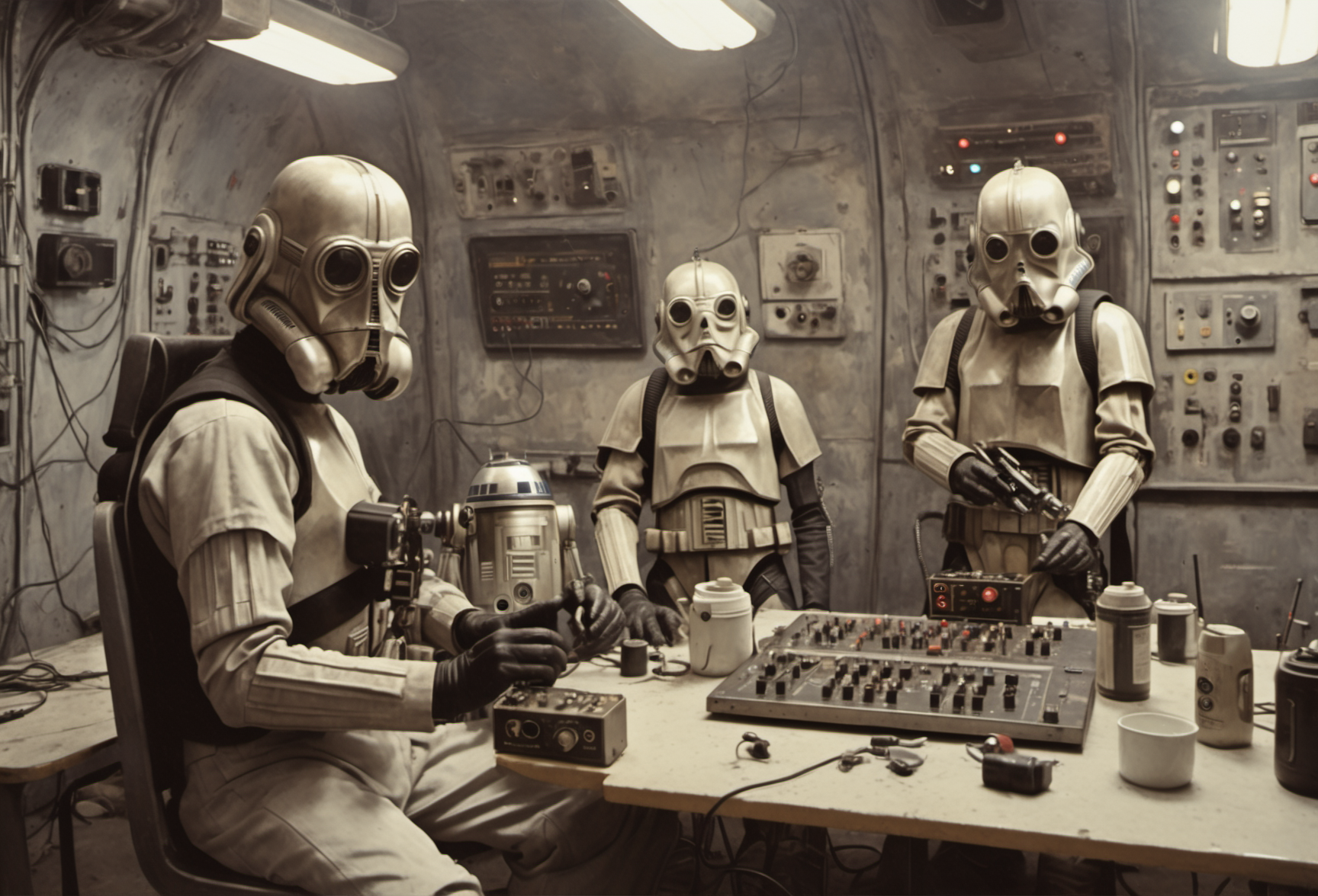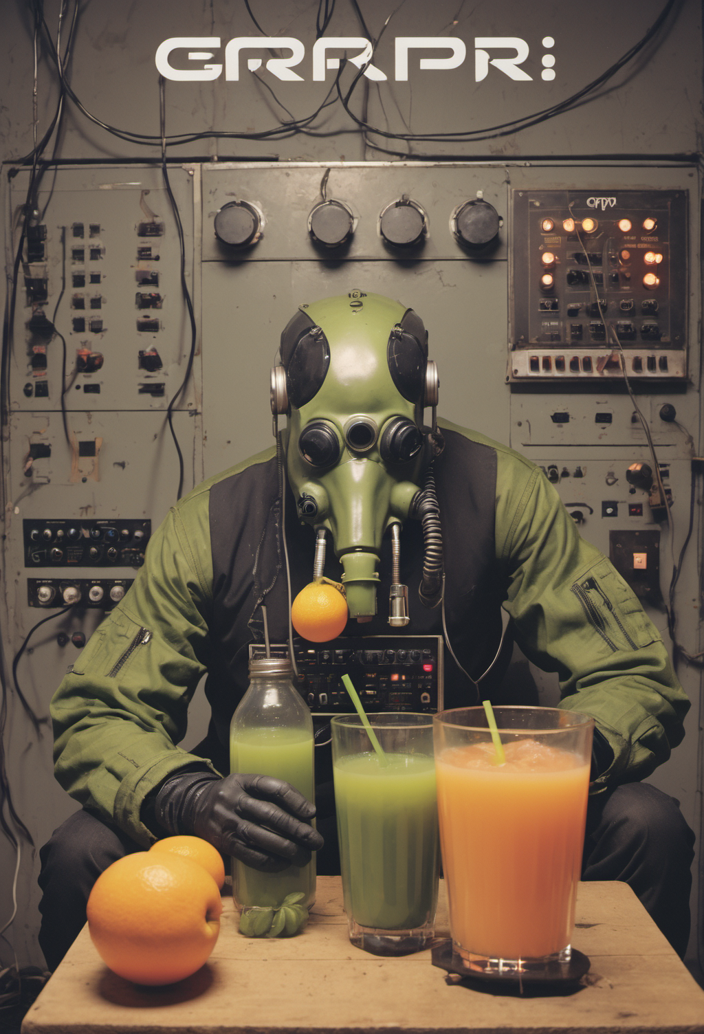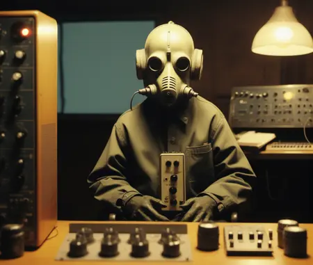 #2 - "가스마스크 남자들" / 예술 스타일 - 핵 시설과 전쟁 중 가스마스크를 착용한 사람들을 다룬 Midjourney 쇼케이스 이미지 10장과, 벙커에서 오래된 통신 장비(CB 라디오 등)를 사용하는 남성들의 이미지 몇 장을 기반으로 학습됨.