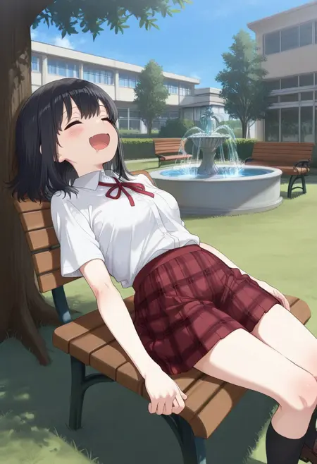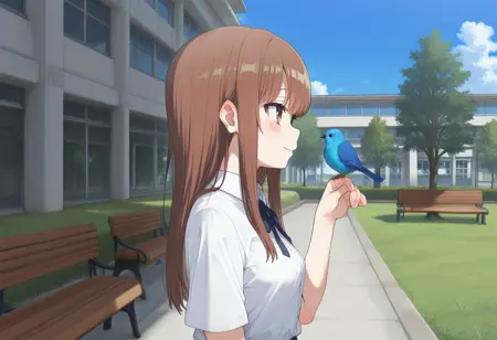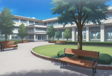 courtyard,(tree:0.8), courtyard,sitting, holding sandwich, lunch,blue sky,day,outdoors,path,road,day,night,twilight,sunset