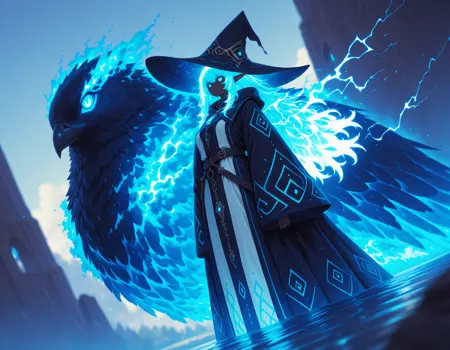 "Flatline, Flat vector illustration,,masterpiece, best quality, good quality, very aesthetic, absurdres, newest, 8K, depth of field, focused subject, dynamic angle, dutch angle, Tall female elf sorceress , glowing hair, glowing eyes, wearing detailed robe and witch hat, blue electricity sparks, giant blue glowing wolf companion next to her, magical wolf companion, holofoil glitter, faint, glowing, ethereal, neon hair, long hair, glowing hair, flowing hair, otherworldly glow, dangerous, magical water temple in background, water in background, hkcompanion "