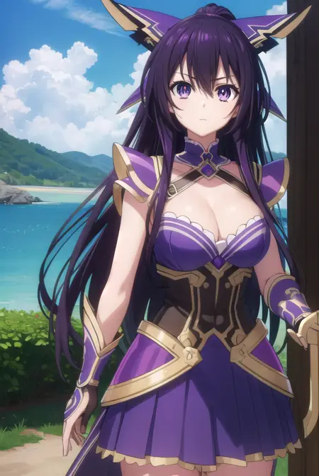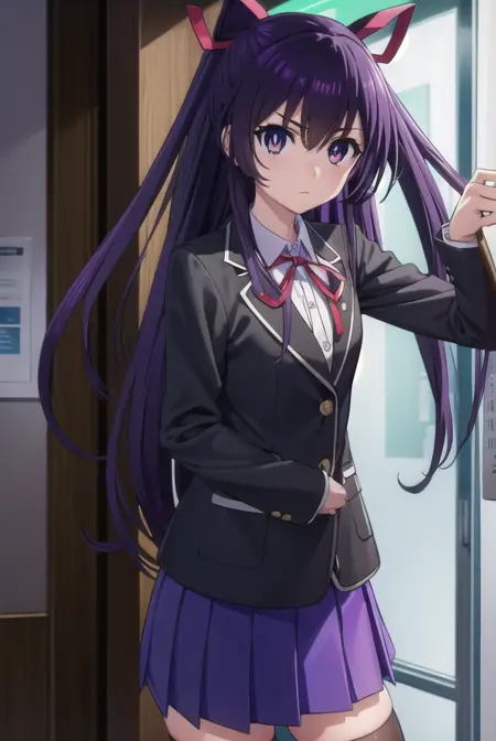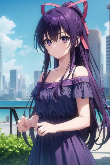 tooka yatogami, hair ribbon, (purple eyes:1.1), purple hair, long hair, ribbon,