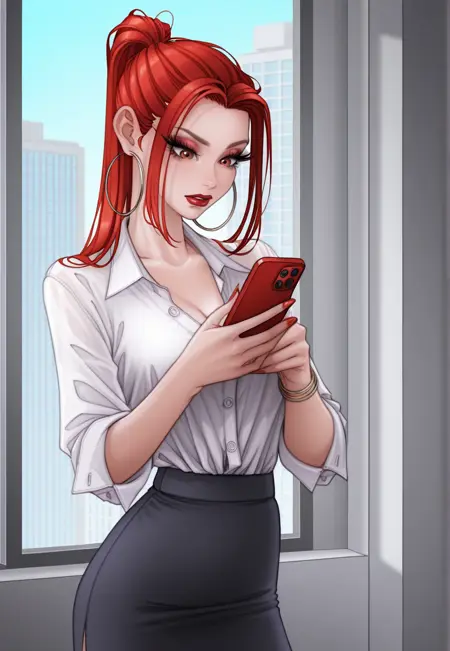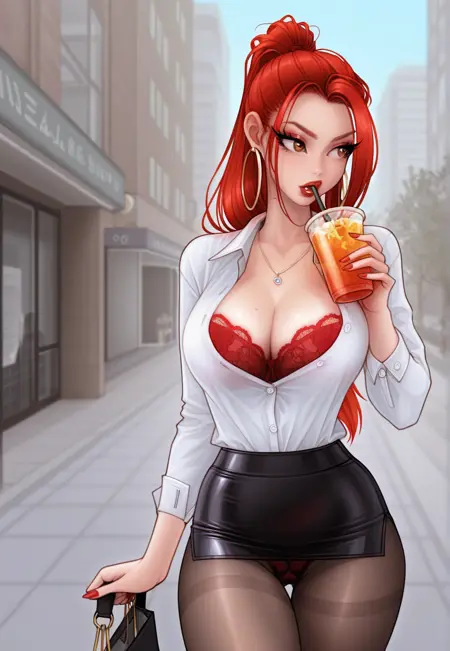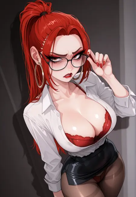 1girl Vanessa_fellat、赤髪、ミニスカート、大きな胸、ポニーテール、ジュエリー、イヤリング、パンティーホース、リングイヤリング、胸元、赤いブラ、化粧、赤いネイル、裸、赤いパンツ
