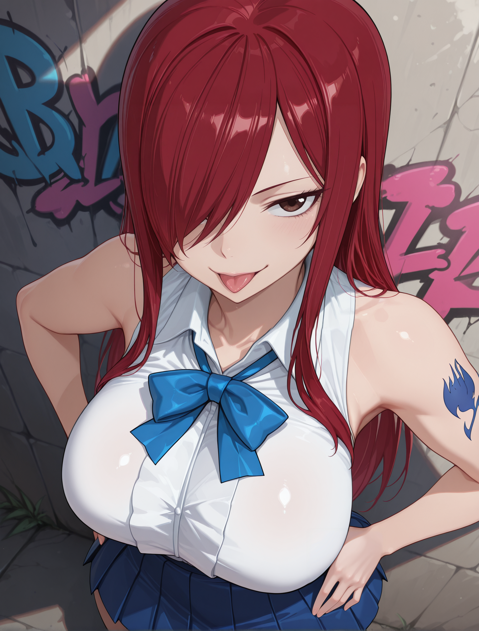 タグとオリジナル: Erza_Scarlet、茶色の目、赤髪、長髪、片方の目に髪がかかる