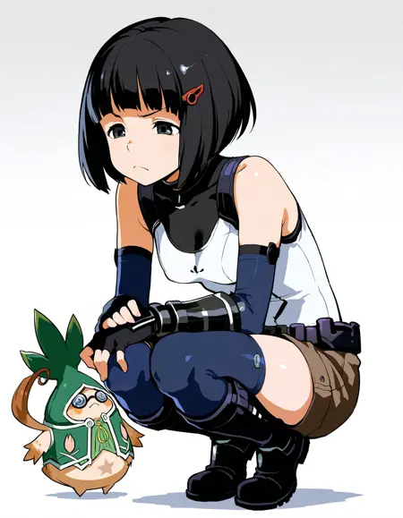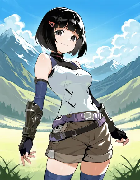 Add "hairclip,elbow gloves,fingerless gloves,gauntlets,white shirt,belt,brown shorts,blue thighhighs,knee boots" for her typical look.