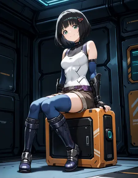 Add "hairclip,elbow gloves,fingerless gloves,gauntlets,white shirt,belt,brown shorts,blue thighhighs,knee boots" for her typical look.