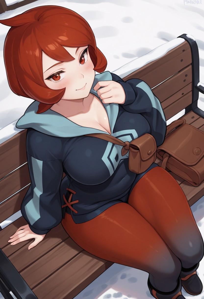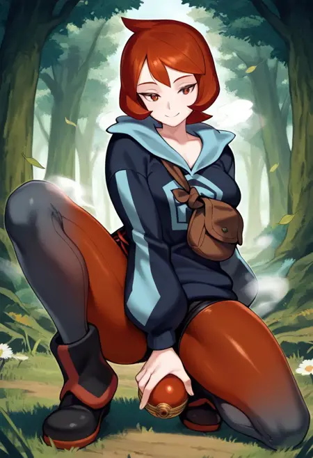 태그: Arezu, 1girl, arezu, 빨간 머리, 곱슬머리, 짧은 머리, 빨간 눈, 후디, 긴 소매, 팬티스타킹, 반바지 아래 팬티스타킹, 부츠, 갈색 가방