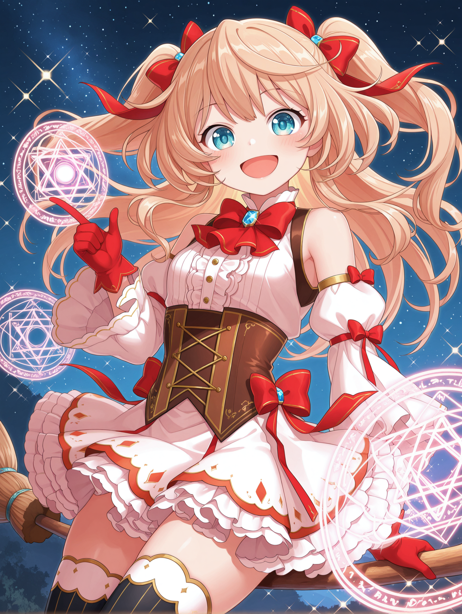 ascot, white shirt, center frills, brown corset, white skirt, detached sleeves,red gloves, thighhighs