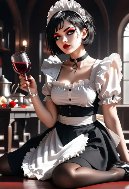 キャラクター4l14andra, black hair, short hair, makeup, red lips, nail polish, red nailsblack wings, feathered wings, topless, medium breasts, crow, birdmaid, apron, maid headdress, black skirt, white shirt, puffy sleeves, pantyhose, black shoesblack jacket, open jacket, black shirt, red necktie, black skirt, black thighhighs, black boots
