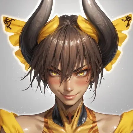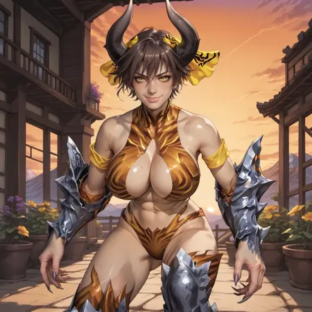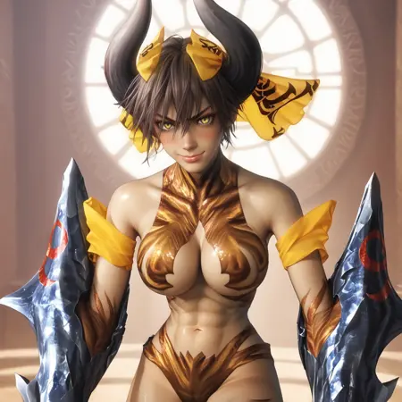 기본 형태: 타탄카, 몬스터 걸, 검은 피부의 여자, 뿔, 노란 히잡, 단발, 갈색 머리, 노란 눈, 어깨 노출, 가슴, 배꼽, 갑옷 장착된 팔, 발톱, 갑옷 장착된 다리, 하이힐