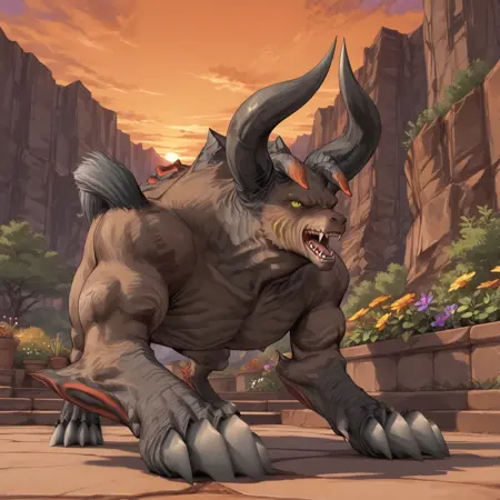 보스 형태: 불탄카, 몬스터, 동물, 네 발로 걷는, 뿔, 갈색 털, 노란 눈, 발톱,