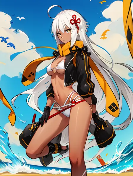 - hair ornament, yellow eyes, bangs, gloves, long sleeves, jacket, black jacket, bikini, white bikini, orange scarf,
