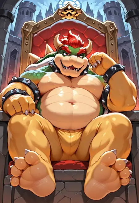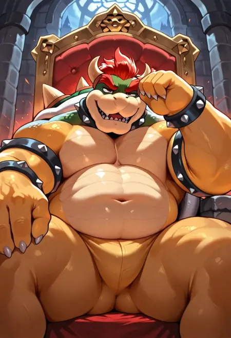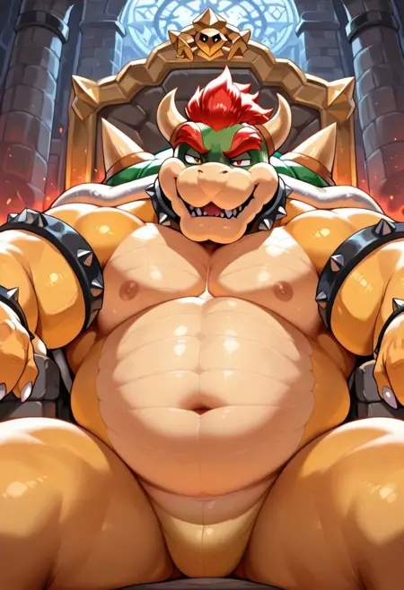 Bowser,yellow body,spiky shell,spiky bracelet,spiky collar,red hair,musclegut,muscular male,white sclera,red eyes