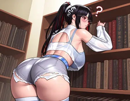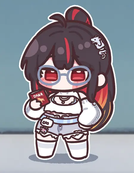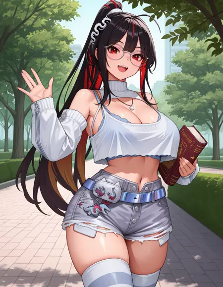 Moran: Off Duty Queen tags: multicolored hair, black hair, red hair, streaked hair, ponytail, glasses, dragon hair ornament, white crop top, turtleneck, sleeve zipper, detached sleeves, long sleeves, red eyes, necklace, short shorts, denim shorts, grey shorts, torn shorts, open fly, blue belt, white belt pouch, dinosaur charm, dinosaur footprints, blue bra, white thighhighs, striped thighhighs