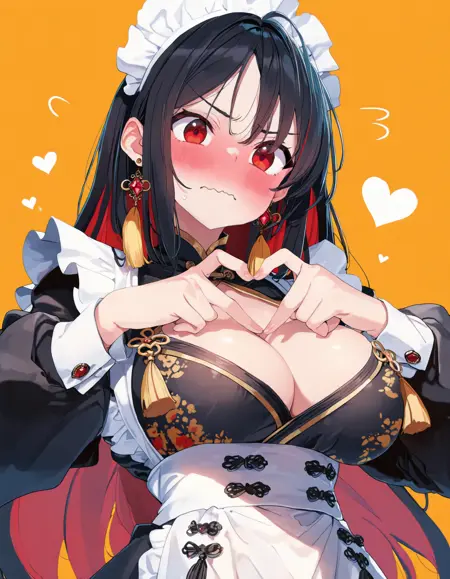 Basic tags (Can get most of the look): 1girl, black hair, red hair, multicolored hair, colored inner hair, jewelry, tassel earrings, chinese clothes, shrug (clothing), china dress, black dress, yellow dress, floral print, eyewear hang, clothing cutout