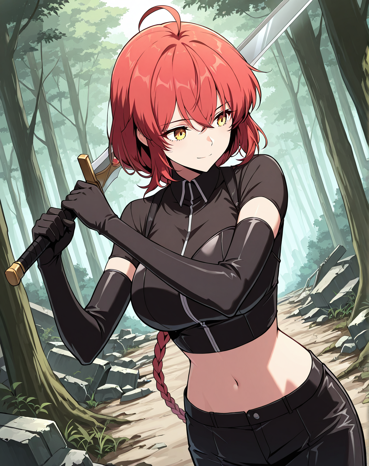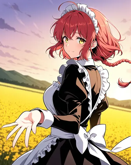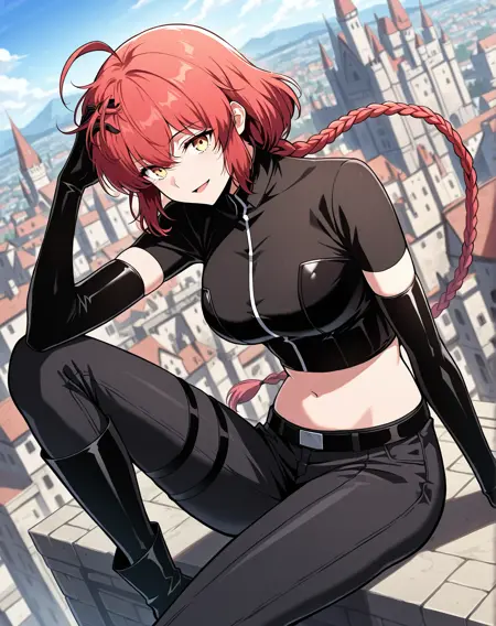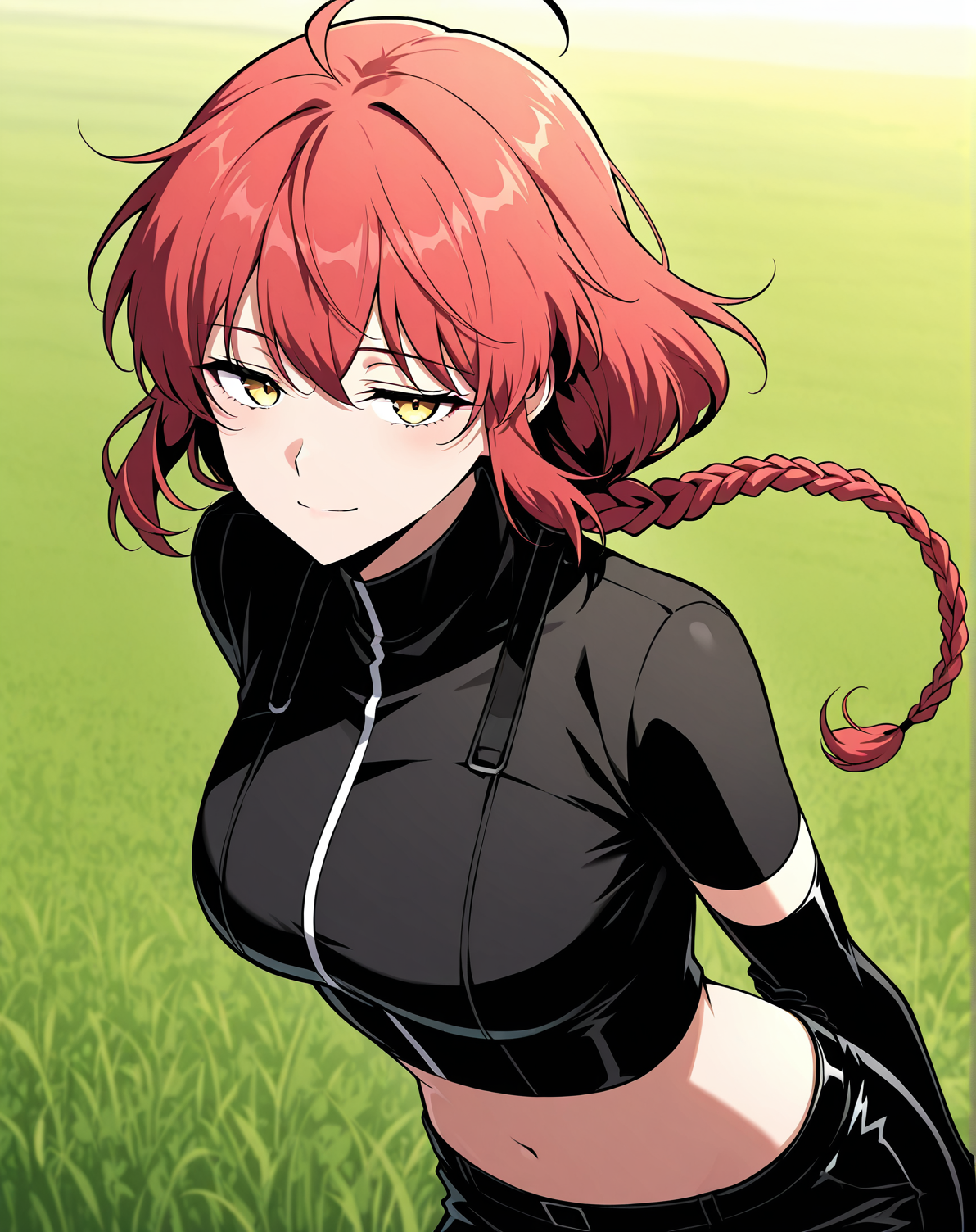 1 girl, solo, long braided ponytail, red hair, short hair, ahoge, yellow eyes
