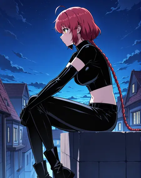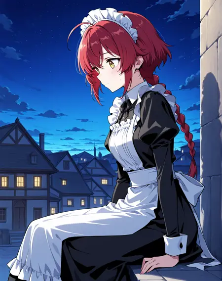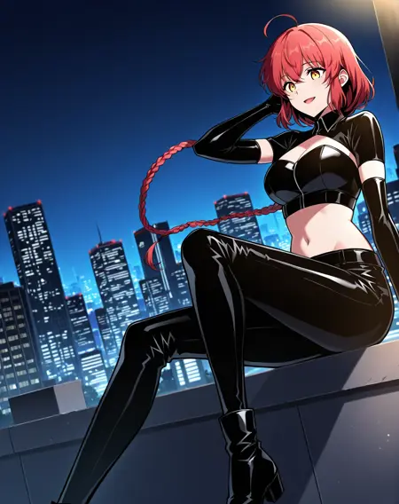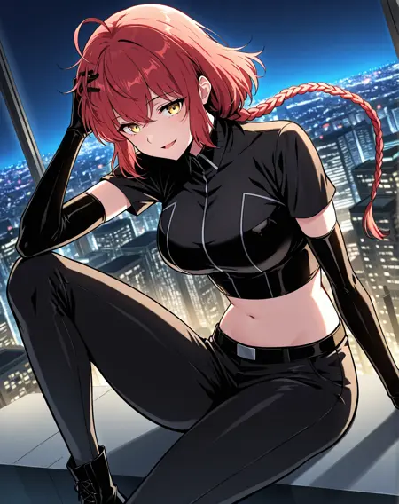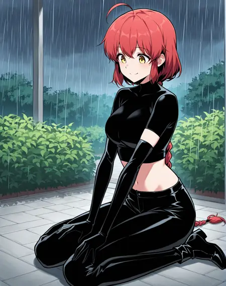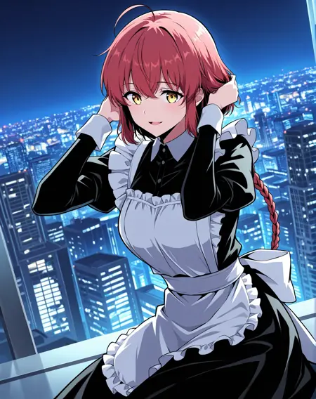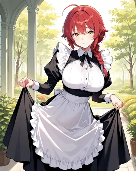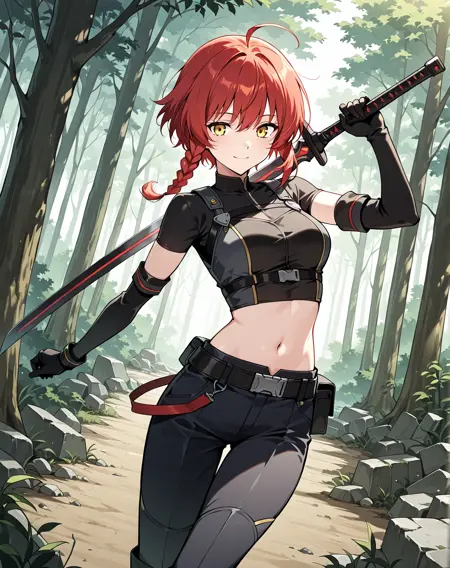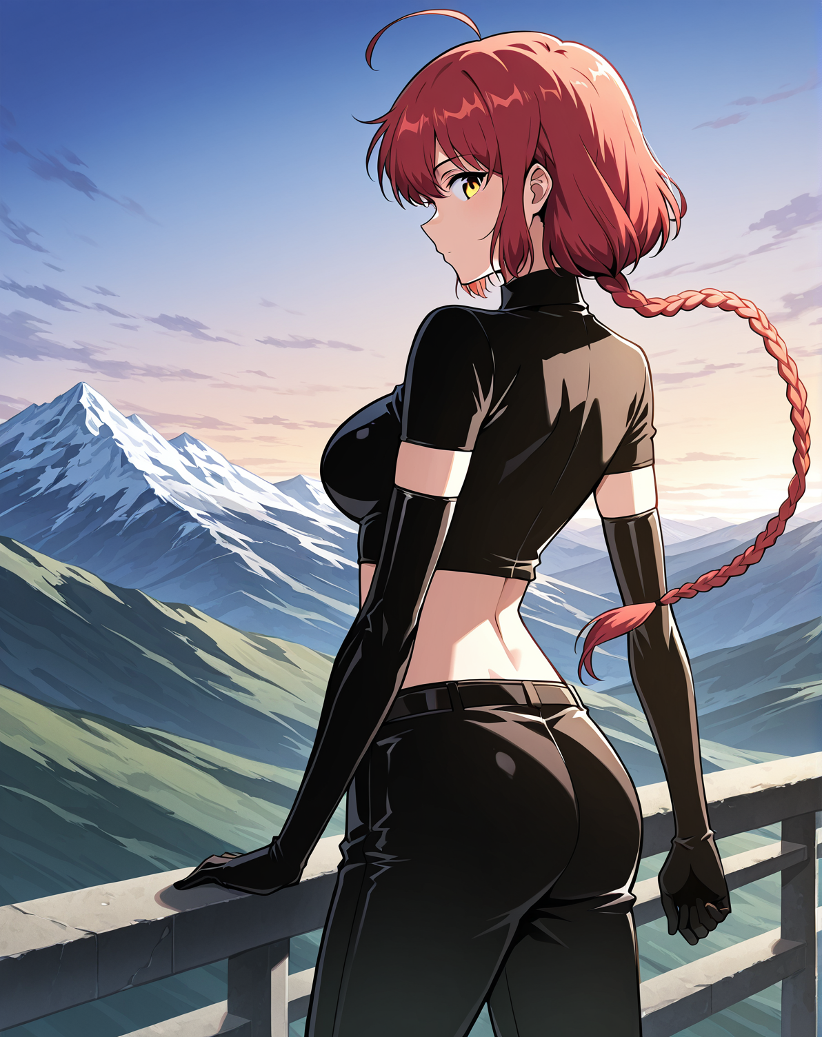 1 girl, solo, long braided ponytail, red hair, short hair, ahoge, yellow eyes