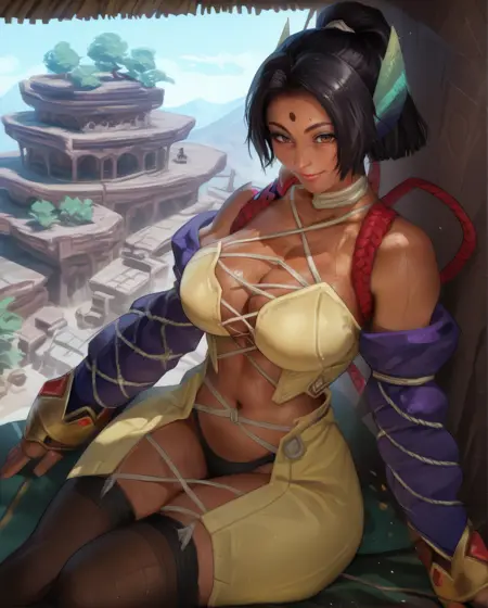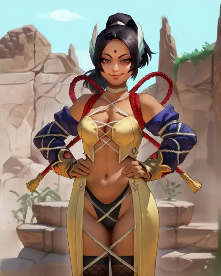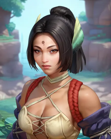 donaxl, 黒髪、茶色の目、額の模様、ポニーテール、青い羽の耳、