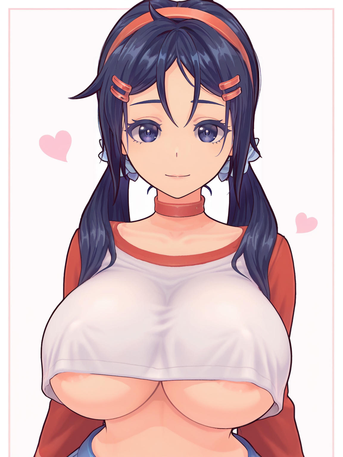 Recommend prompt: "mi_ta, 1girl, dark blue eyes, dark blue hair, braids hair, hairband, choker, scrunchie, barrette pins"