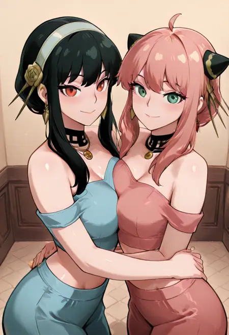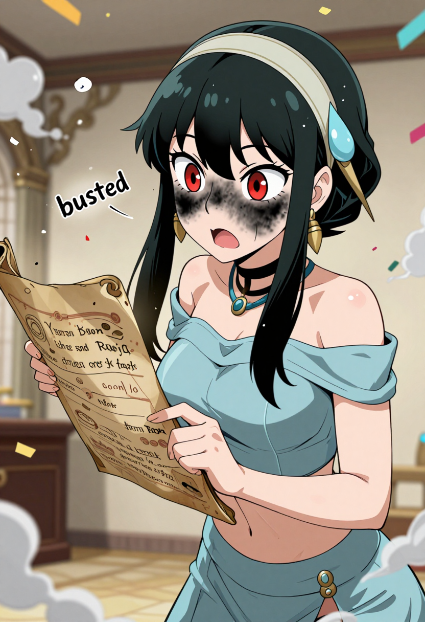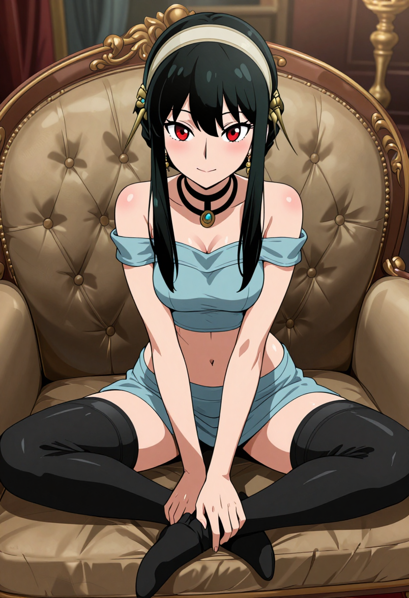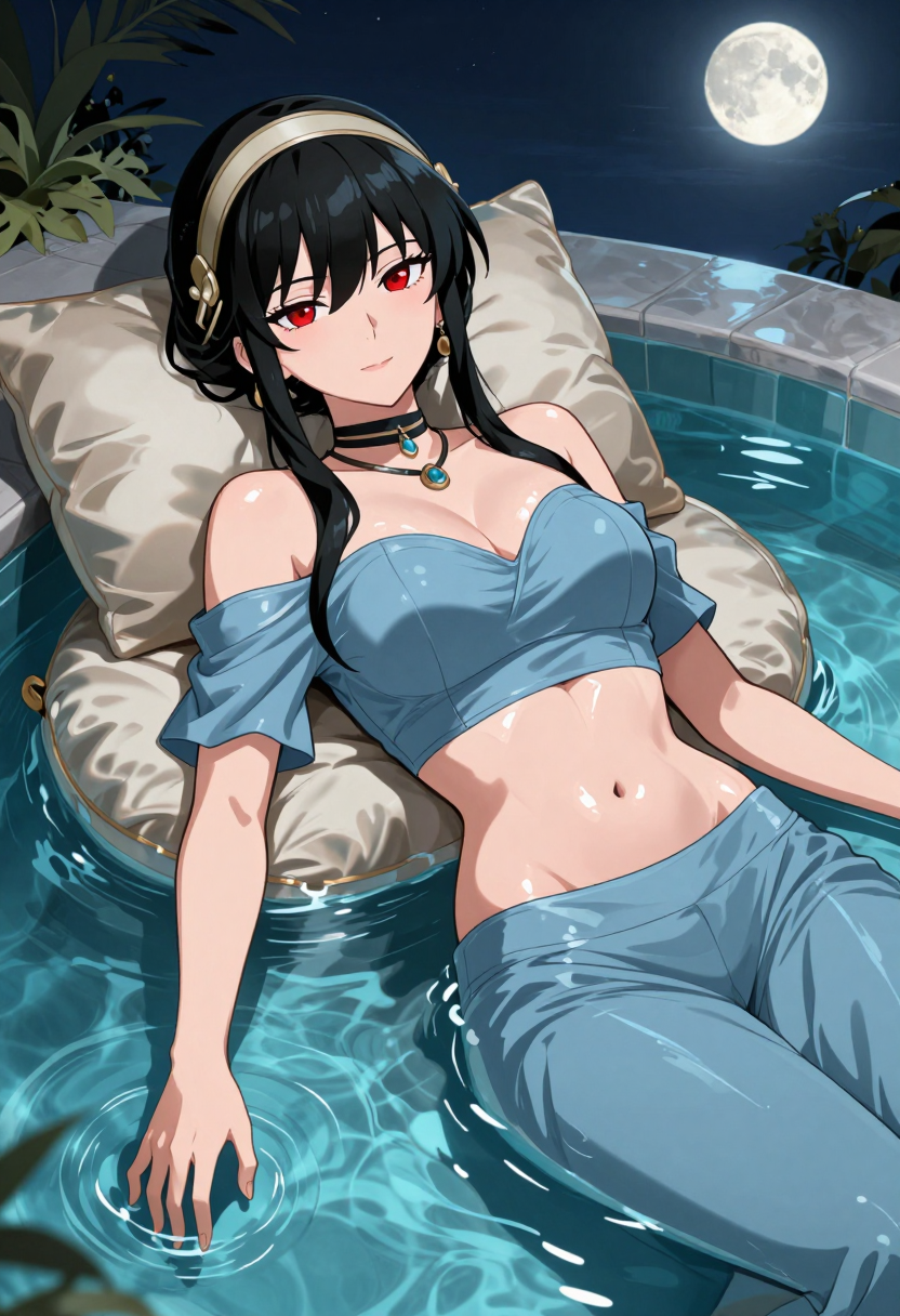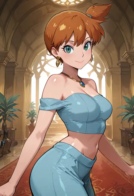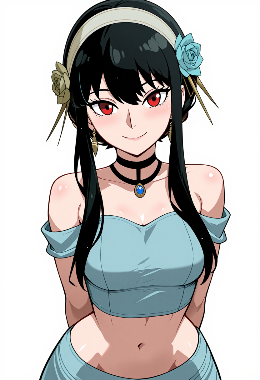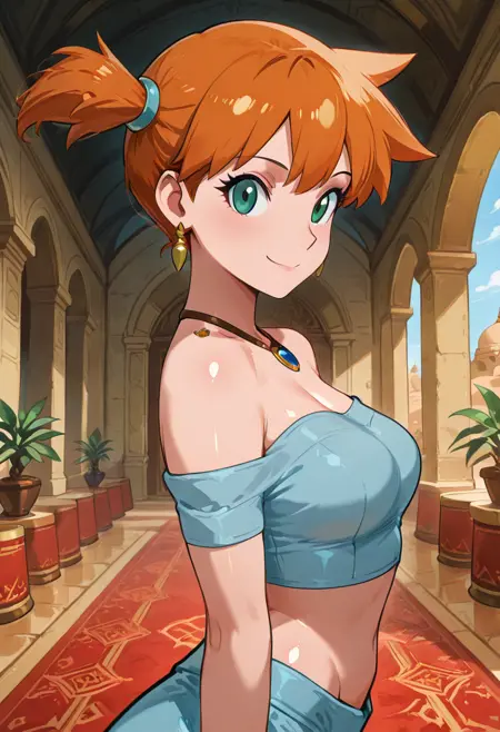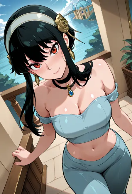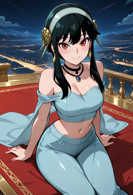 zzYor, red eyes, black hair, short hair with long locks, sidelocks, necklace, earrings, hairband, off-shoulder shirt, blue shirt, midriff, sleeveless, blue pants, arabian clothes,