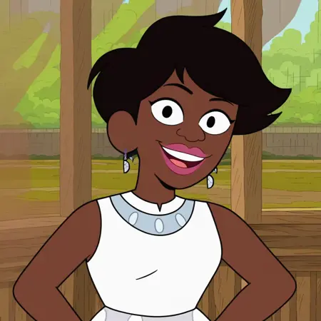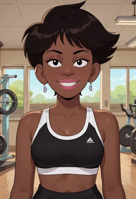 1girl, Solo, KimWilliams_cotc, 深棕色皮肤, 黑色眼睛, 蓬松头发, 黑色头发, 短发, 粉色口红