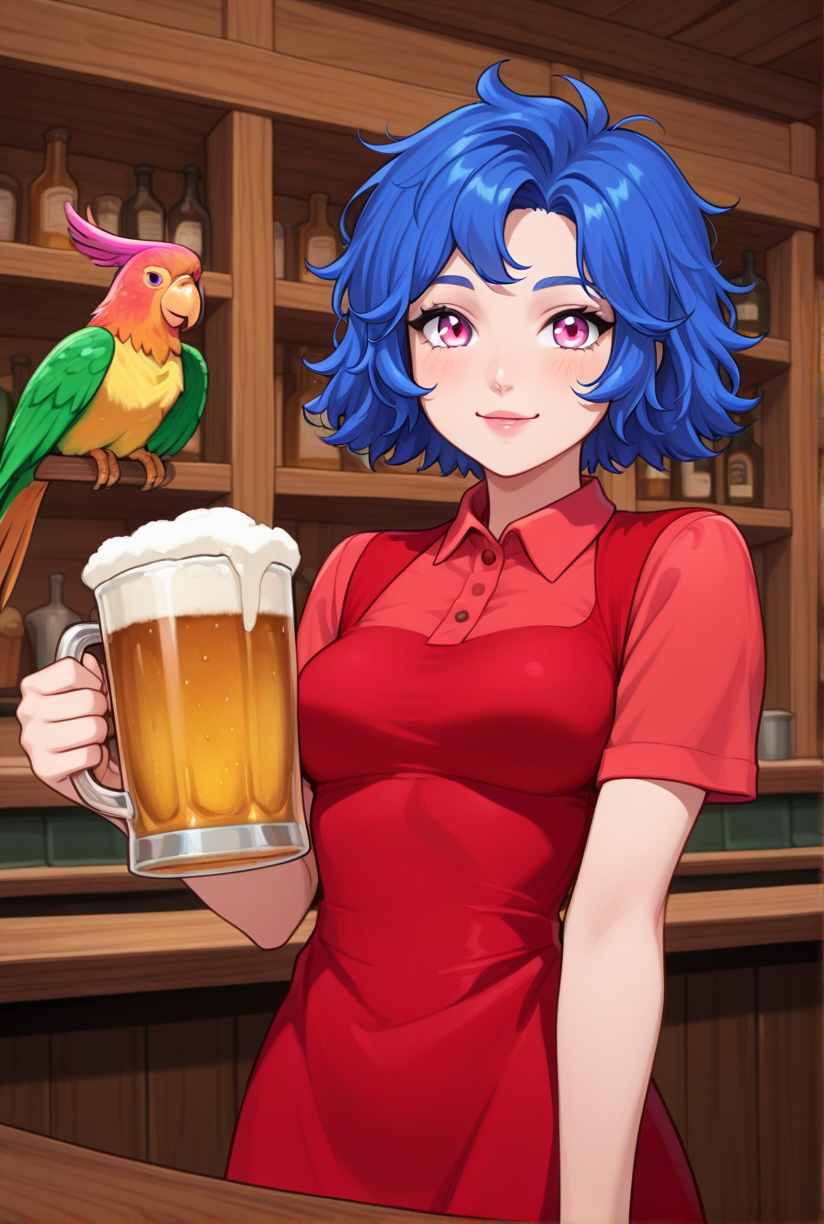 役立つ可能性のあるオプションの単語: 青い髪、乱れた髪、短い髪、ピンクの目、インコ