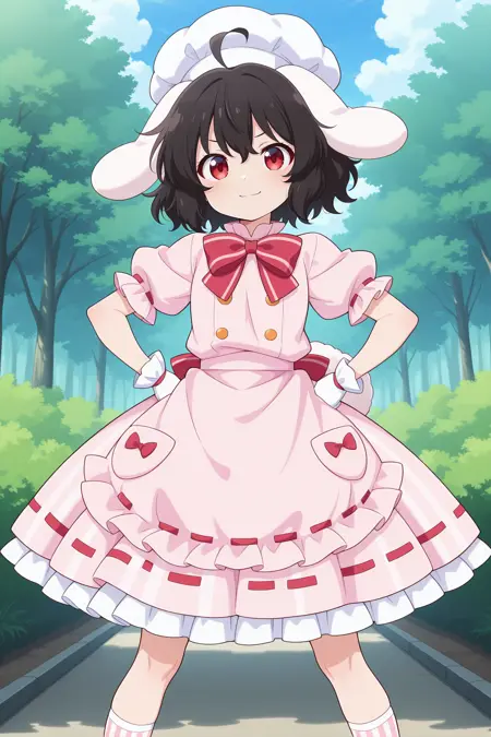 inaba tewi, 1girl, solo, red eyes, black hair, short hair, rabbit ears, floppy ears, rabit tail, inaba tewi \(happy patissiere\), ahoge, alternate costume, chef hat, white hat, red bowtie, pink dress, food-themed clothes, frilled apron, frilled dress, waist apron, pink apron, pink ribbon, puffy short sleeves, ribbon-trimmed apron, ribbon-trimmed dress, vertical-striped bow, vertical-striped dress, white gloves, white skirt, blue footwear, buttons,