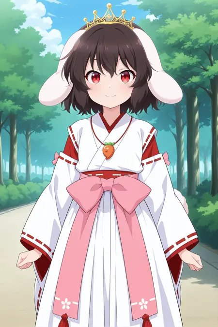 inaba tewi, 1girl, solo, red eyes, brown hair, short hair, rabbit ears, floppy ears, rabit tail,, inaba tewi \(white earth rabbit\), alternate costume, dress bow, pink bow, magatama necklace, tassel, white dress, white skirt, white kimono, ribbon-trimmed sleeves, long sleeves, wide sleeves, hair ornament, gold tiara, miko crown,