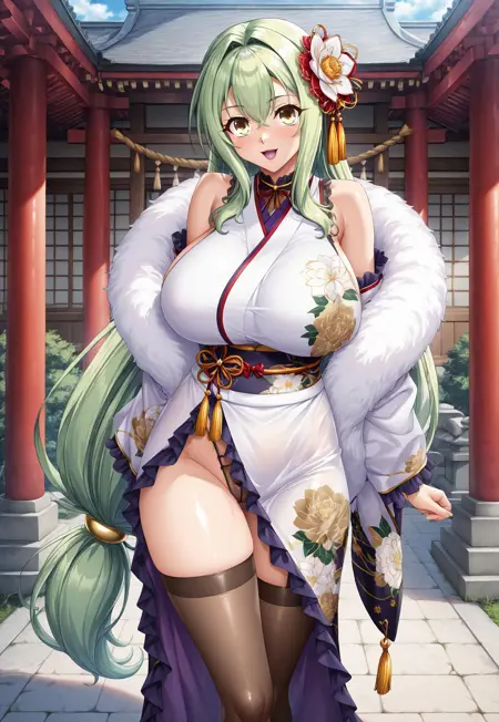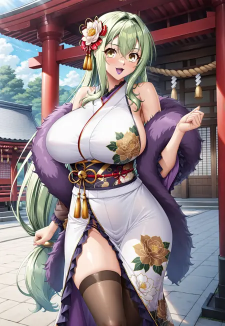 第二套服装:白色花卉图案和服,金色镶边,牡丹图案,深紫色毛皮披肩,披肩搭在肩上,紫色半透明高低裙,褶边裙摆,黑色过膝长袜,黑色露趾高跟鞋,脚踝带,大型红白色发饰,发饰,金色与紫色腰带