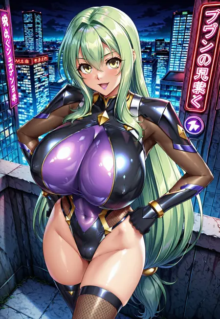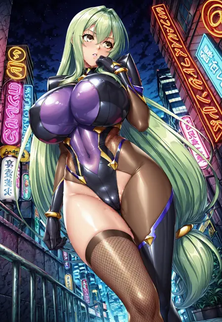 标签:爱朱·赫比可(未来)、极长发、低扎长发、绿发、中分刘海、头发遮住眼睛、绿黄色眼睛、紫色嘴唇、妆容、口红、巨大乳房
