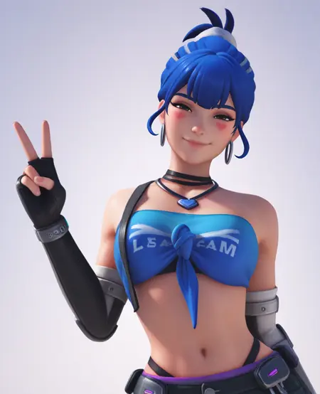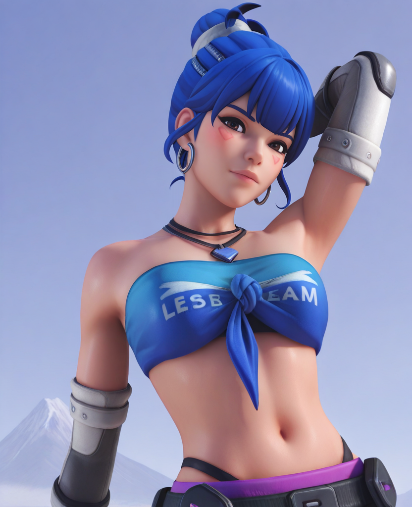 dv2, 1girl, blue hair, single hair bun, brown eyes, facial mark, tube top, front-tie top, elbow gloves, hoop earrings, necklace, choker, fingerless gloves, panty straps, midriff, pants,