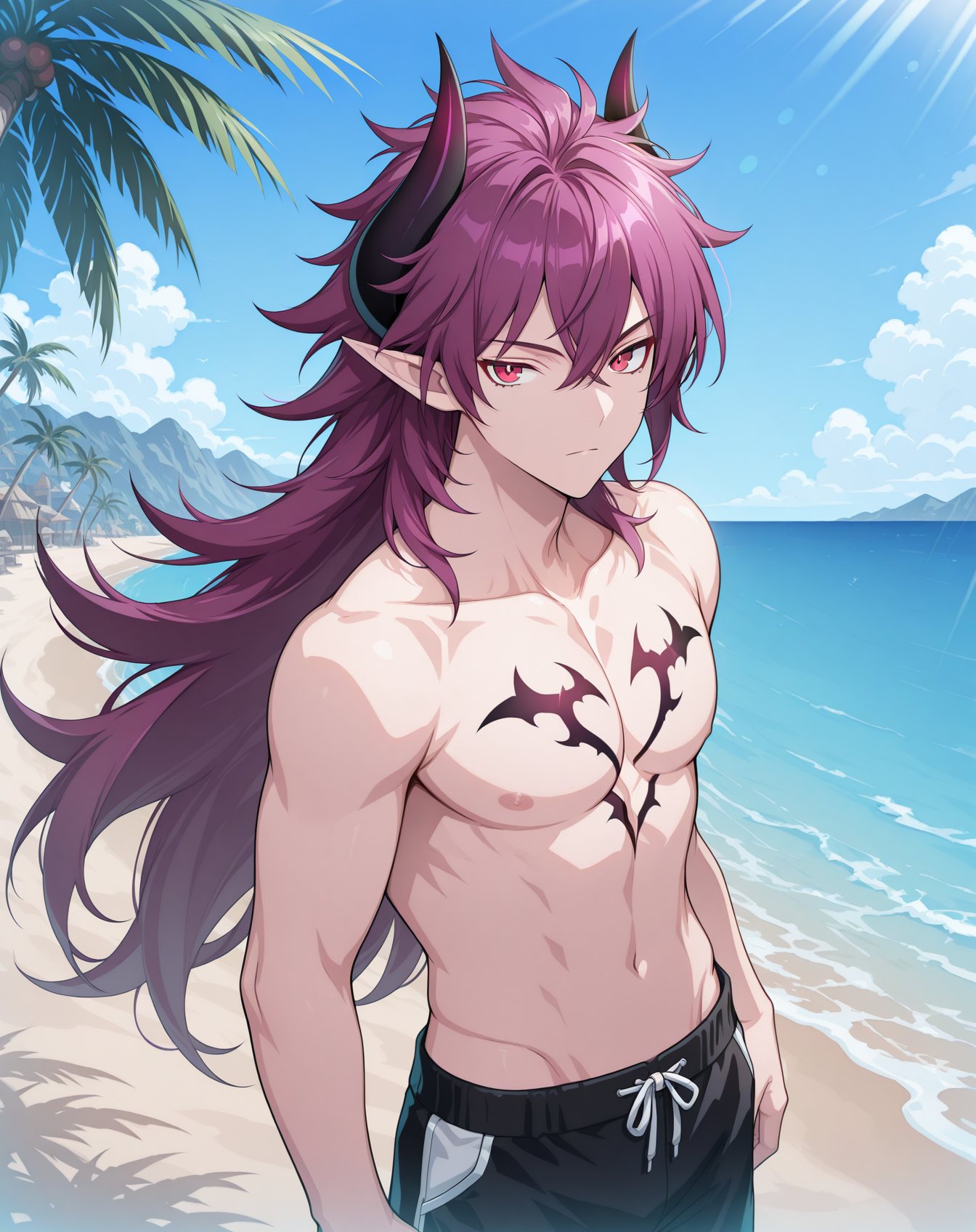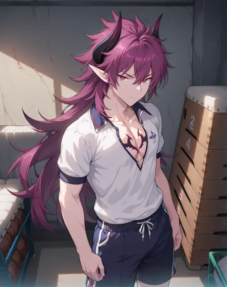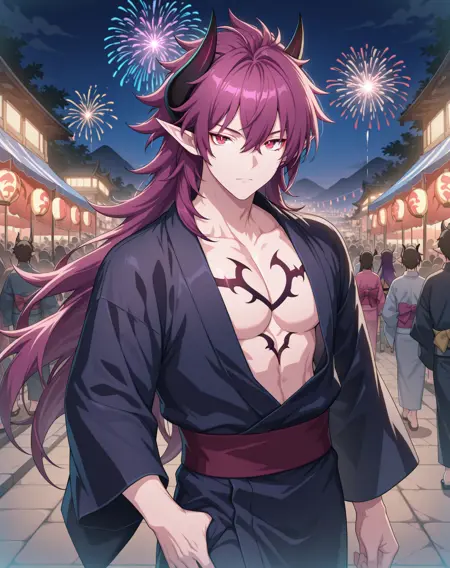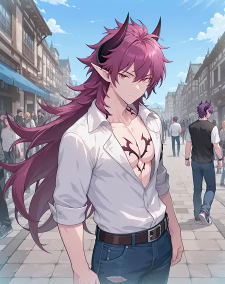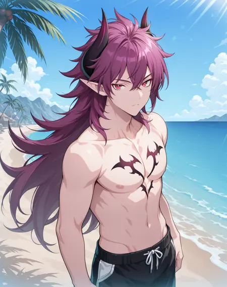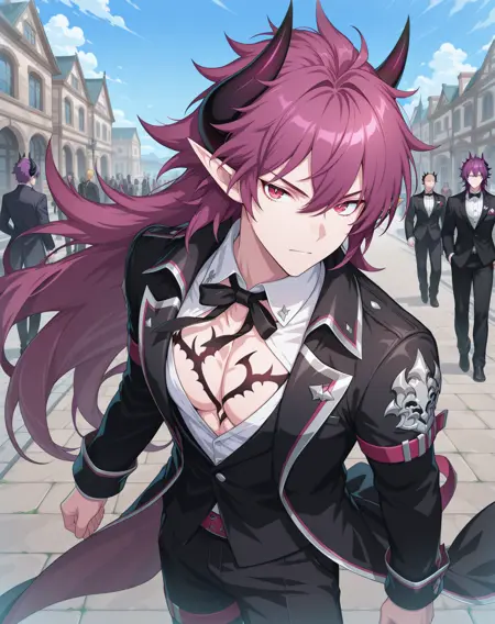 他的发色既不是粉红、也不是红色或紫色,我在尝试了几个LoRA后,试着用了“品红”这个词,结果竟然有效!这就是为什么不同版本中的头发颜色标签不一致的原因。