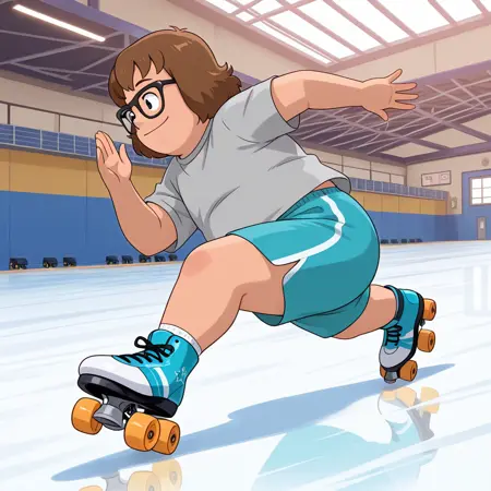 grey t-shirt, short sleeves, blue pants, roller skates,
