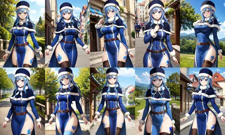 服装2(卷发)aajuvia, curly hair, hat, capelet, fur trim, blue dress, long sleeves, brown belt, pantyhose