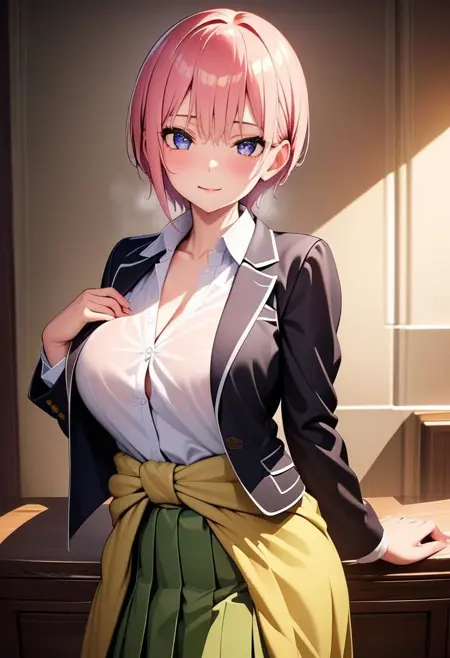 触发词:ichika_a_xl,短发,粉发,白衬衫,有领衬衫,黑色夹克,西装外套,敞开式夹克,长袖,腰部衣物,绿色裙子,百褶裙,